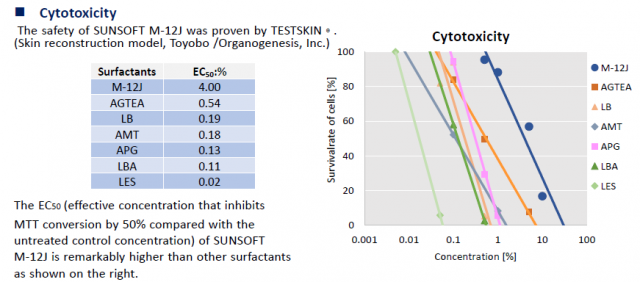 11 Oct 比胺基酸界面活性劑更溫和的 SUNSOFT M-12J 2021 回列表 日本太陽化學的專利界面活性劑,實驗證明泡泡量跟溫和度都更勝胺基酸起泡劑。在日本屬於食品級原料,安全性更高,應用在食器清潔或是嬰幼兒產品都很適合。日本也有醫療通路使用SUNSOFT M-12J在異位性皮膚炎患者使用的清潔用品。 原廠刺激值比較數據: 回消息列表