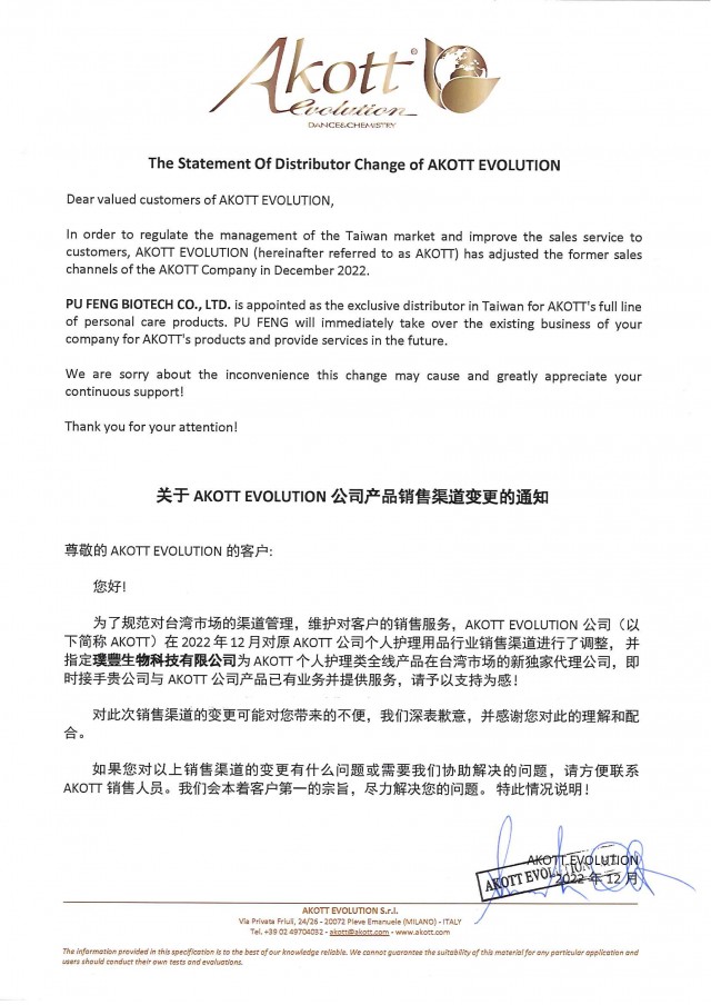 璞豐生物科技有限公司於2022年12月正式成為義大利活性成份生產商AKOTT在台唯一獨家代理,銷售全系列產品包含: